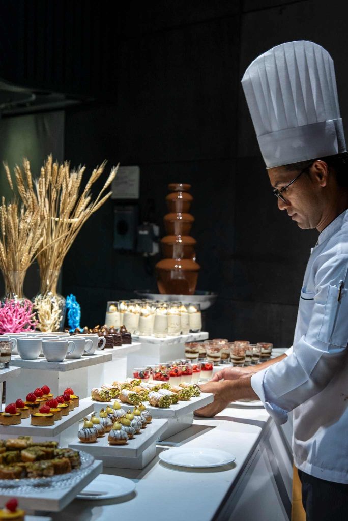 Guests can wander between stations discovering raspberry clafoutis, Turkish baklava, and tiramisu, before pausing for a slice of Basque burnt cheesecake or a spoonful of almond rice pudding. The panna cotta, light and silky, is balanced by the richness of chocolate pot de crème, while profiteroles, macarons, and crème brûlée create a sense of Parisian patisserie in the heart of Dubai.