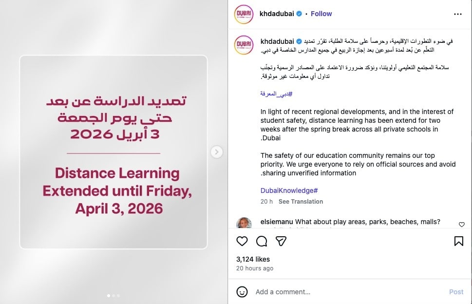 The Knowledge and Human Development Authority (KHDA) confirmed that distance learning will remain in place across the emirate as a temporary measure, aimed at supporting the safety and wellbeing of students and staff.