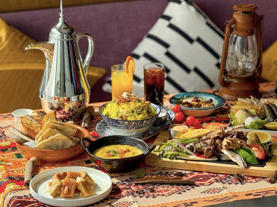 HANU offers a modern, share-style Ramadan iftar that blends Korean flavours with Middle Eastern tradition — thoughtful, communal, and genuinely different. Rooted in the spirit of Jeongsik (a structured complete meal), the table arrives as a generous spread: kimchi hummus, salads, kimbab, crispy bites, wagyu gyoza, kochi skewers, banchan, namul and an Arabic breadbasket. The centrepiece is “Meat Me at the Grill” with two chef-selected cuts, served with green leaf baskets and scallion salad, followed by dates, HANU date cake, mango coconut bingsu and fruit. Non-alcoholic options like jallab and laban with mint keep things beautifully on-theme. It’s a standout for foodies who want an iftar that feels curated and conversation-worthy.