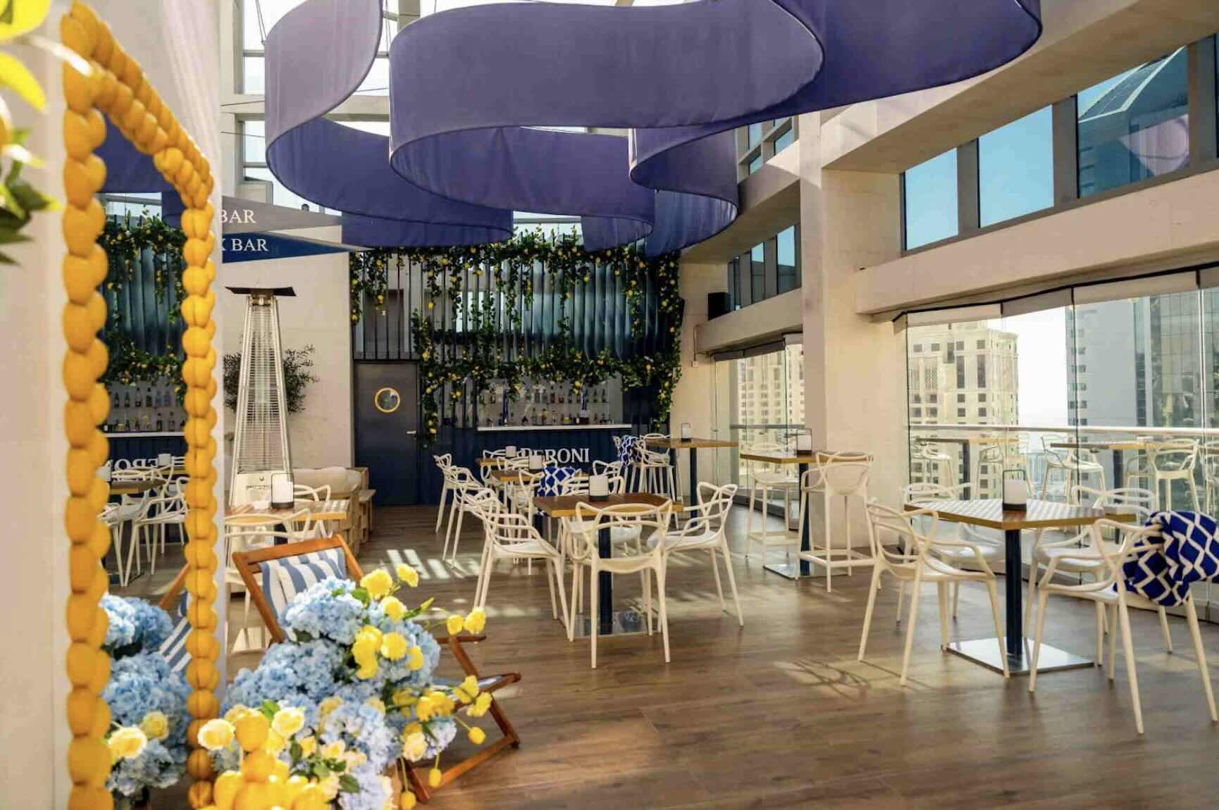 On entering Rex Bar, the first moments are about taking it all in. The blue and white chairs set the tone, the kind you expect to see on a Mediterranean terrace rather than in the middle of Dubai. Baskets of lemons are tucked into the corners, small details that give the space its Italian edge. Then the view comes into focus. Wide stretches of Dubai Marina open up in front of you, with the Palm and the open sea beyond, jet skis cutting across the water and yachts gliding past far below.