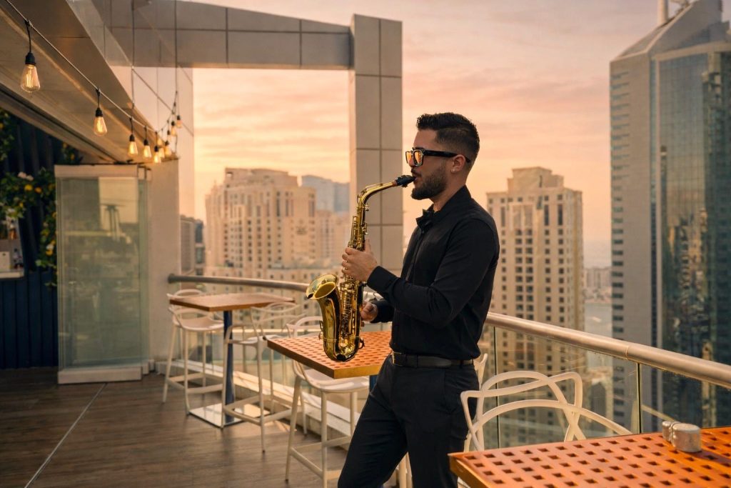 (Image: Saxophonist on the terrace, overlooking Marina and Jbr)