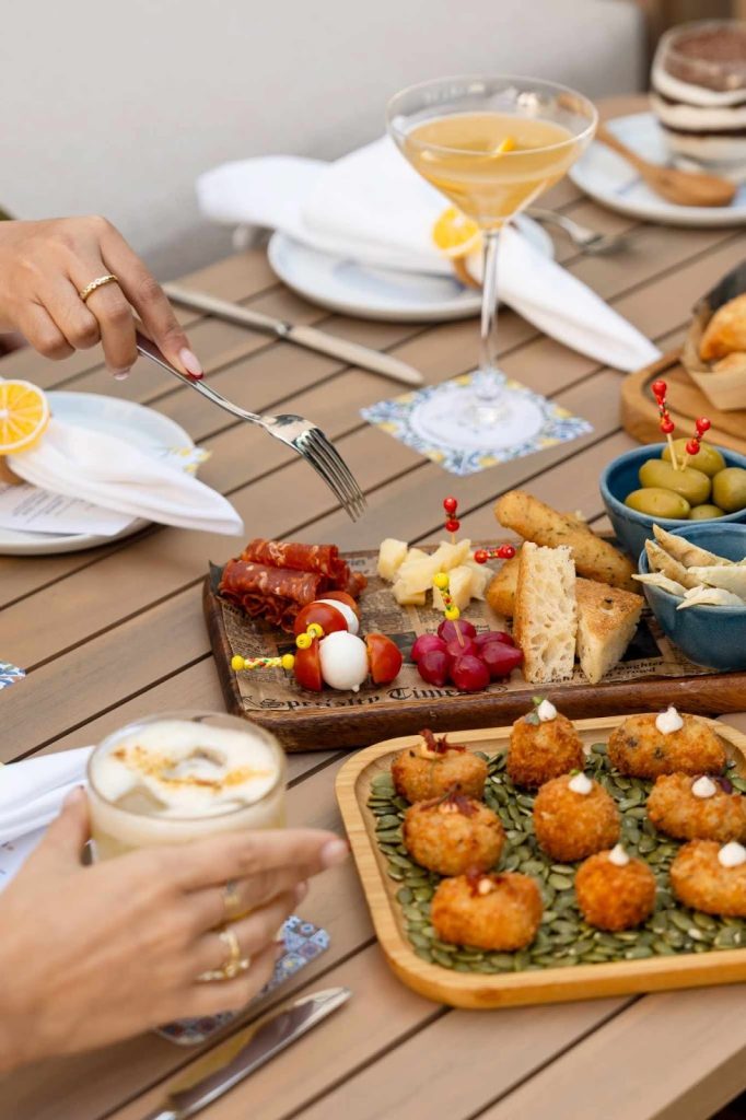 The drinks menu sets the direction for the night, built around Italian-leaning spritzes, sharp martinis and cocktails that stay light even as the evening moves on. Aperol runs through much of the list, paired with coconut, plum, rooibos, yuzu and jasmine, mandarine and orange blossom. There are cleaner classics too, negroni, old fashioned, margarita, whisky sour, alongside signatures like Dolce Far Niente with grappa, roasted pineapple and cardamom, or Amalfi With View built on bourbon, ginger and mandarine. A yuzu and jasmine spritz arrives cold and citrus-led, the kind of drink you come back to without needing to think twice.